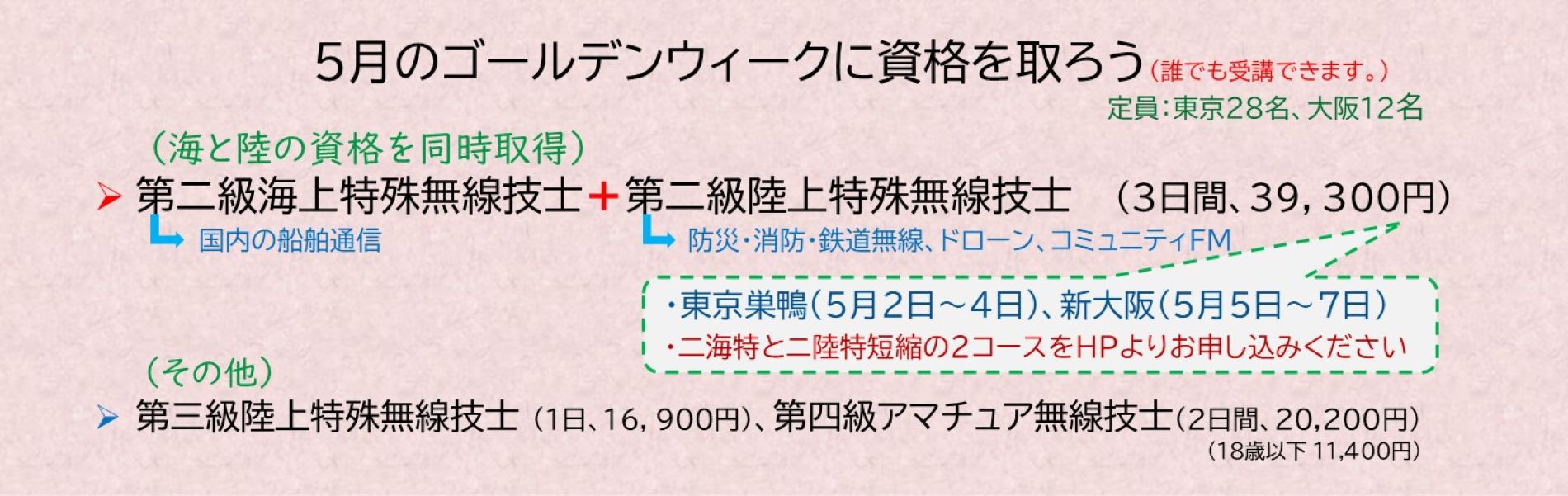 | 航空資格 | 航空無線通信士(東京のみ) 航空特殊無線技士 |