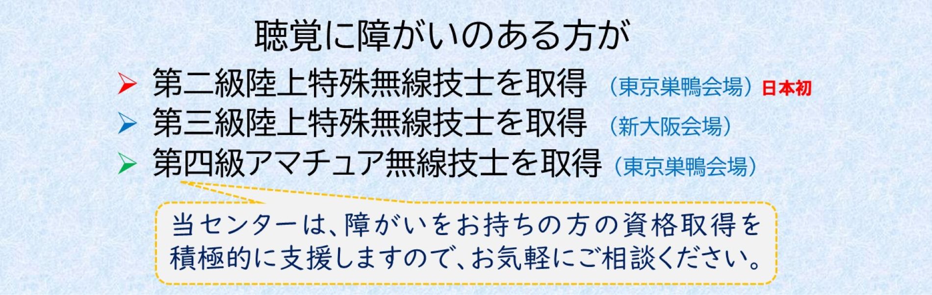 - 当センターは、無線従事者の育成を目的とする非営利法人で、講習最後の修了試験に合格すると無線従事者の免許証を取得することができます